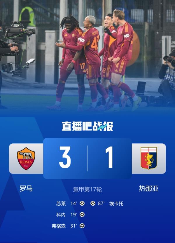 意甲第17轮,罗马3-1战胜热那亚升至第四,苏莱进球。