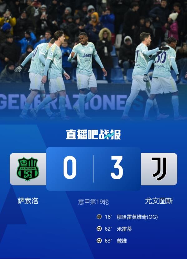 戴维传射建功,萨索洛0-3尤文。积分榜方面,尤文36分暂升第四,萨索洛23分第十。
